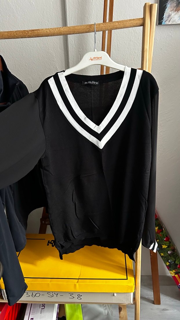 Siyah renkli, pamuklu triko kazak, V yaka ve uzun kolludur. Salaş kesimi ve midi boyuyla günlük sokak stiline uygundur.