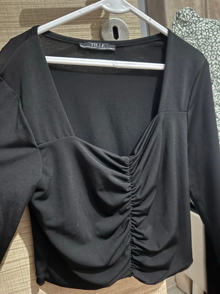 Siyah, V yakalı, uzun kollu kadın bluz. Önde pile detaylı, vücuda oturan kesim ve normal boyda, günlük kullanıma uygun minimalist tarzda.