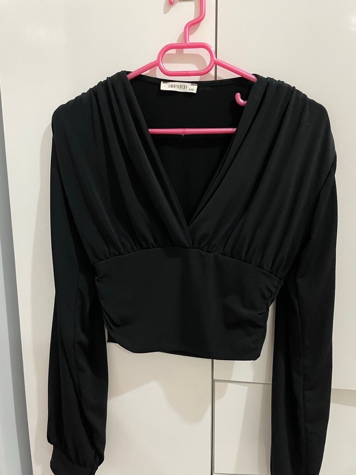 Kadın siyah piliseli bluz, V yaka ve uzun kollu, sentetik dokulu kumaştan. İnce kesimi ve midi boyu ile şık ve rahat bir parça.