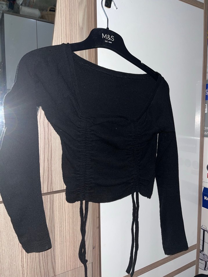 Uzun kollu, V yakalı ve pliseli detaylara sahip siyah, kadın bluz. Yumuşak keten kumaştan, günlük kullanıma uygun. Marka: M&S.