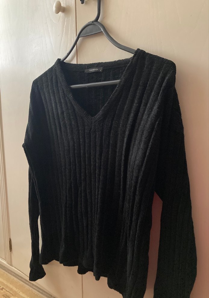 Siyah yün kadın kazak, V yaka ve uzun kollu, bol kesim ile rahat ve gotik tarzda günlük kullanım için uygundur.