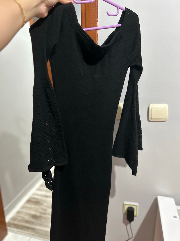 V yaka ve uzun kollu, yumuşak triko kumaştan yapılmış, siyah renkte ve gotik tarzda, günlük kullanıma uygun uzun, vücuda oturan elbise.