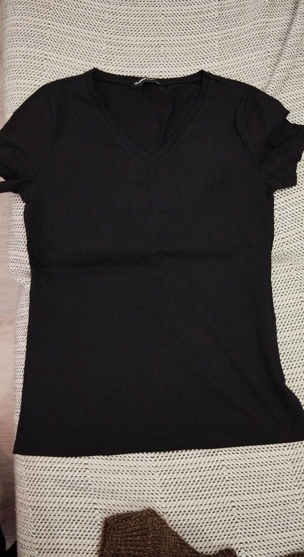 Siyah, V yakalı, kısa kollu ve ince kesim kadın tişörtü. Nefes alan keten kumaştan üretilmiş, günlük kullanım için rahat ve şık bir modeldir.