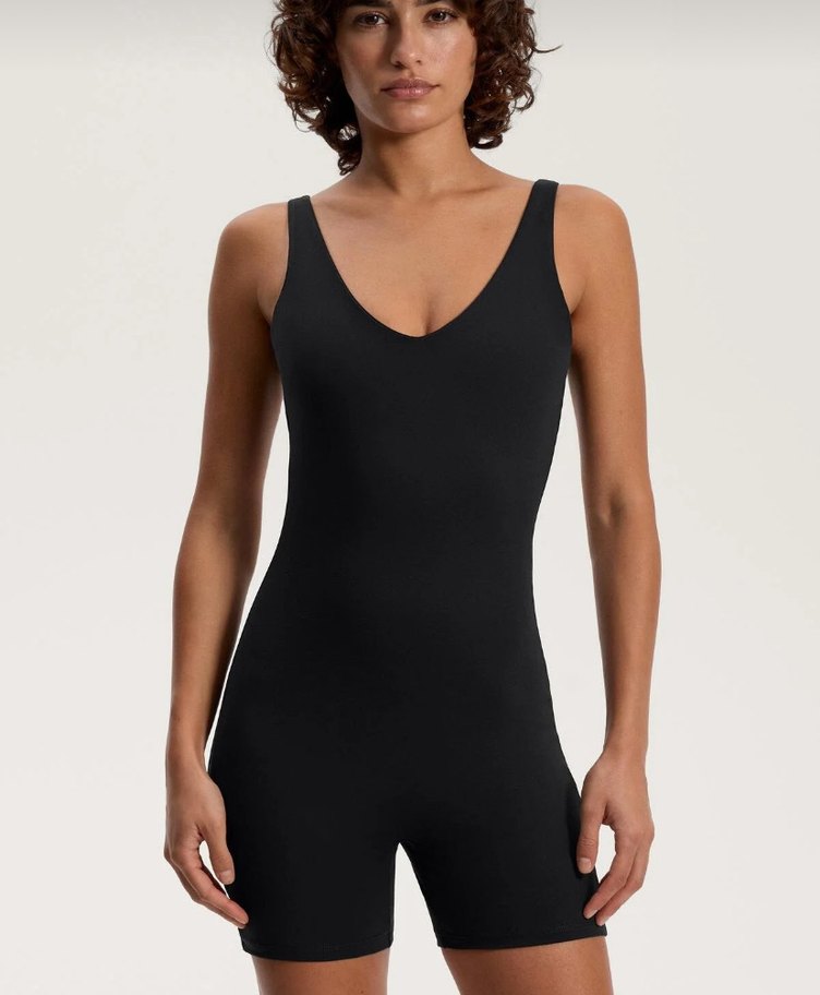 Siyah, V yakalı, kolsuz ve vücuda oturan bu tulum, normal midi boyda ve sentetik kumaştan üretilmiştir. Cesur ve çağdaş athleisure tarzı sunar.