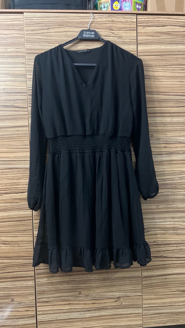 Siyah midi elbise, V yakalı ve uzun kollu, fırfır detaylıdır. Rahat kesim ve büzgülü bel yapısına sahiptir, yumuşak sentetik kumaştan üretilmiştir.