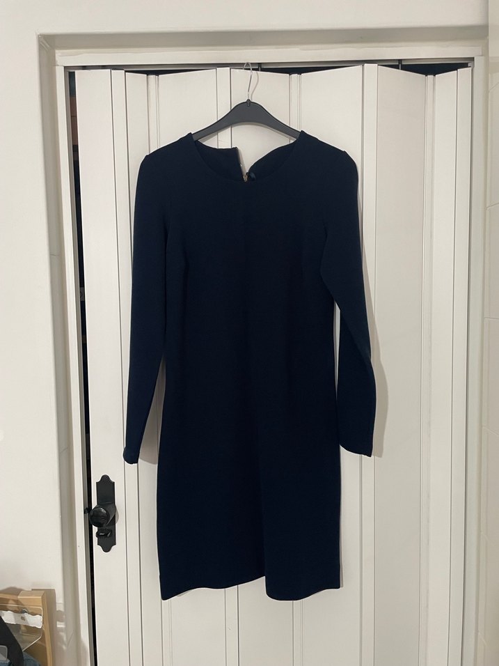 Siyah midi triko elbise, V yaka ve uzun kollu, düz kesim ve minimalist tasarıma sahiptir. Yumuşak sentetik kumaştan, günlük kullanıma uygundur.