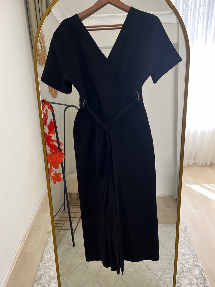 Kadınlar için uzun siyah tulum, V yaka ve bel kemeri ile. Düz, sentetik kumaştan, rahat kesim ve ofis için uygun. Sırttan V şeklinden dekoltesi vardır az kullanılmıştır herhangi bir kusuru yoktur cepli ve kemerlidir
