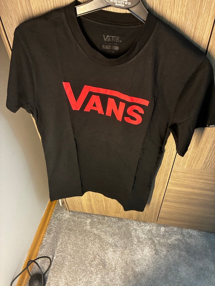 Kadınlar için siyah tişört, kırmızı Vans baskılı, kısa kollu, V yakalı ve rahat kesim, yumuşak sentetik kumaştan üretilmiştir.