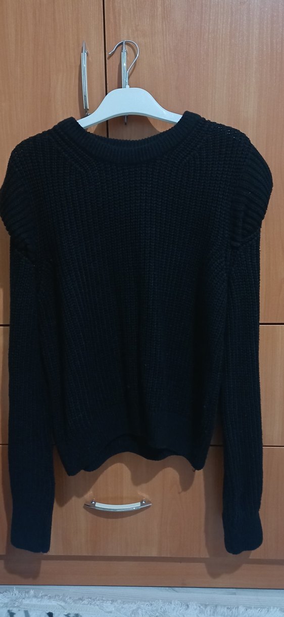 Siyah örgü triko kazak, yuvarlak yaka ve uzun kollu yapısıyla rahat ve günlük kullanıma uygundur.