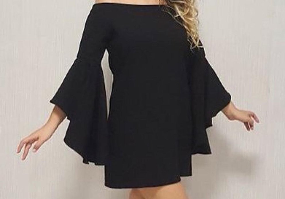 Siyah mini elbise, kayık yaka ve uzun volanlı kollara sahip. Gevşek kesimli, özel günler için uygundur. 38-40 bedene uyumlu.