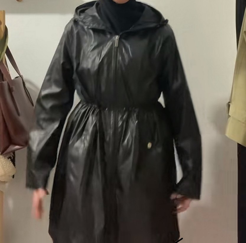Bu siyah yağmurluk, yüksek yakalı ve uzun kolludur. Belden kemerli ve bol kesimdir, günlük sokak stiline uygundur. ️