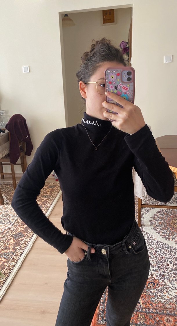 Siyah, yarım balıkçı yaka, uzun kollu ve triko kumaştan yapılmış, günlük kullanım için uygun, sade ve şık bir kadın kazak. Yakasında nothing yazıyor. #bershka #hm #zara