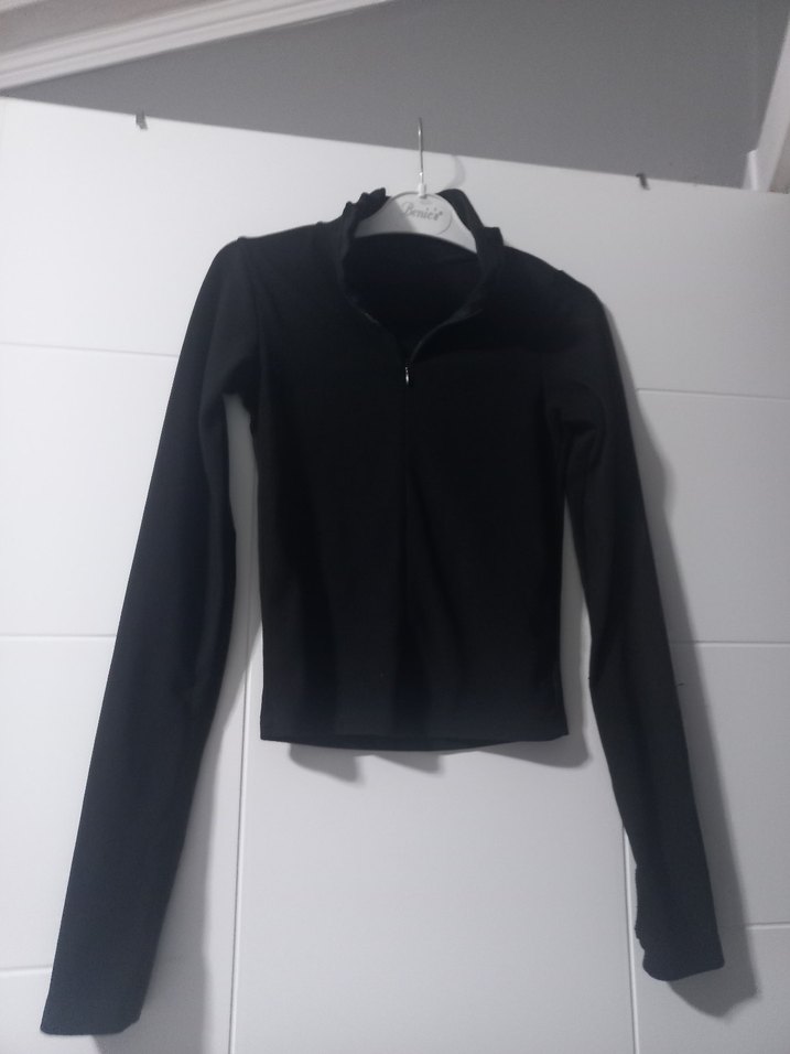 Kadın siyah sweatshirt, yüksek yakalı ve uzun dar kolludur. Yarım fermuarlı ve midi boyda, yumuşak ve sıcak kumaştan üretilmiştir. Günlük kullanıma uygundur, sade ve desensizdir.