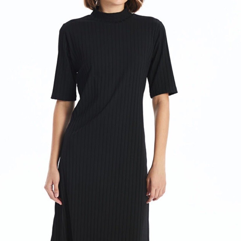 Yarım kollu, yüksek yakalı, pilili dokulu, vücuda oturan midi uzunlukta siyah kadın triko elbise. Ofis için uygun, sentetik kumaştan yapılmıştır.