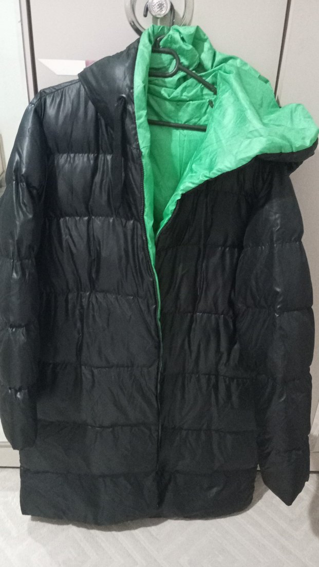 Kadınlar için siyah dış yüzey ve canlı yeşil iç astarlı, fermuarlı, yüksek yakalı, uzun kollu, midi boy sentetik kumaş kışlık mont. Sokak stili için uygun.