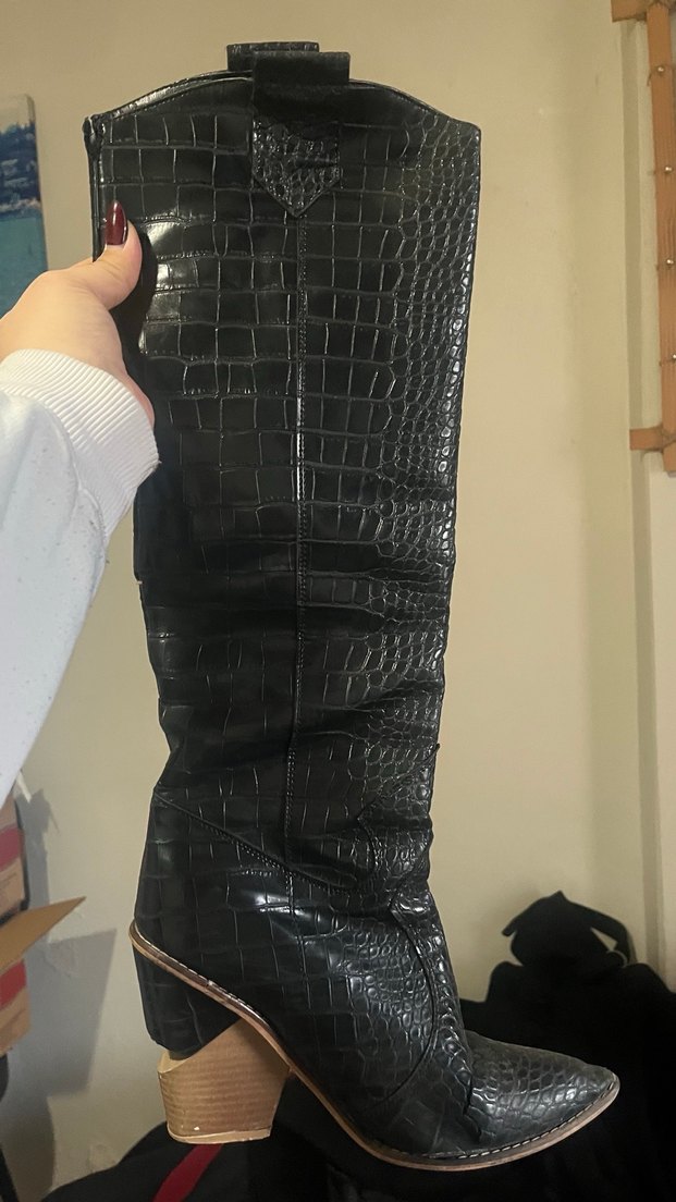 Yılan derisi desenli siyah diz boyu deri çizmeler, tokalı ve kalın topuklu. Trendy günlük sokak stili için uygun. Deride çatlaklar oluştu kullanmaya engel bir durum yok ama bazı bölgelerde yırtıkları var