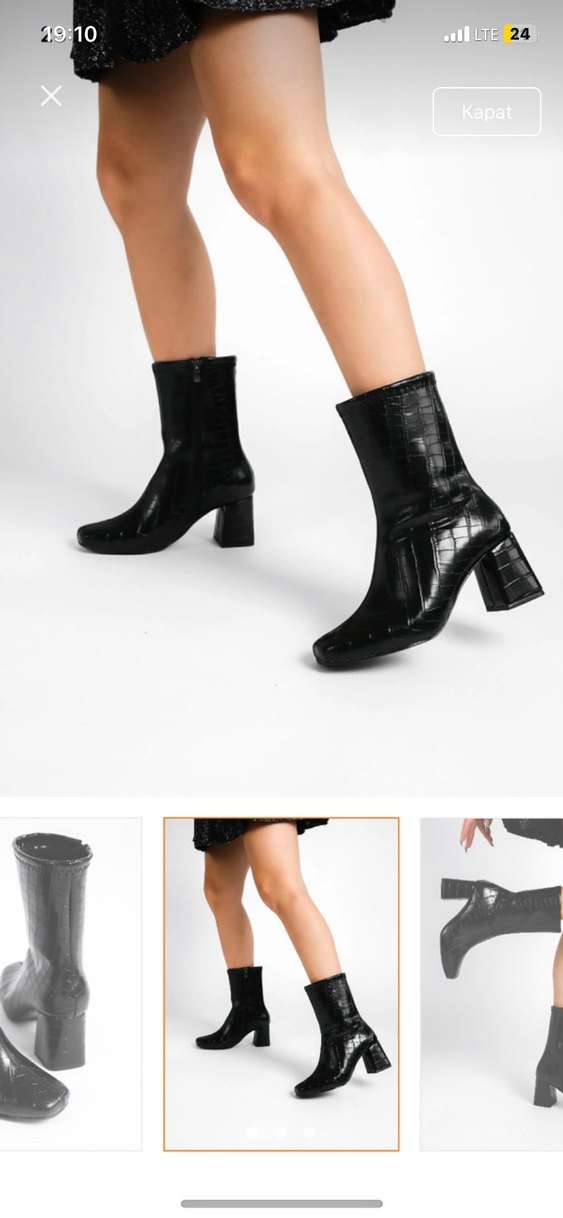 Siyah deri kadın botları, blok topuklu ve yılan deseniyle dikkat çekiyor. Tokalı detaylarıyla modern ve şık bir görünüm sunar.