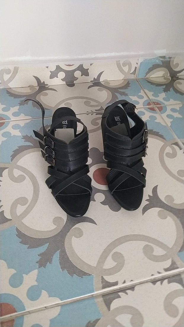 Siyah yılan desenli, kemerli ve dolgu topuklu kauçuk sandalet. Gotik stil için romantik akşamlarınızda tercih edilebilir.
