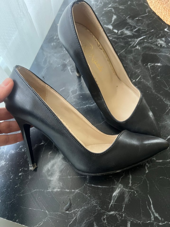 Ofis kullanımı için siyah yılan desenli, bağcıklı stiletto topuklu kadın ayakkabısı.
