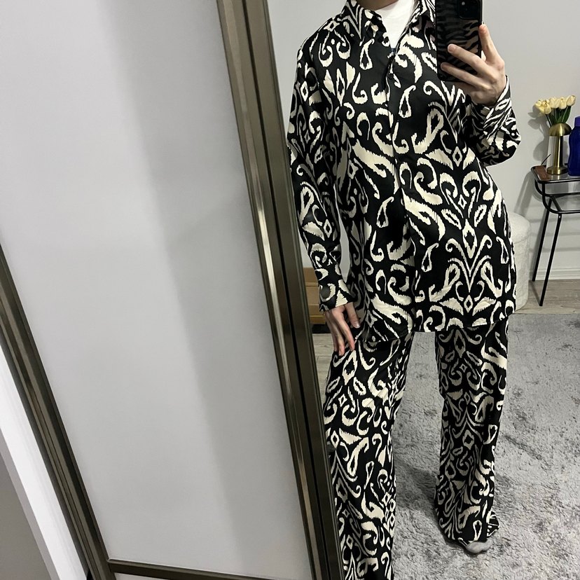 Kadın siyah yılan desenli takım, uzun kesim ve regular fit. Uzun kollu, kesimli yaka ve zincir detaylı, ofis için uygun sentetik kumaş.