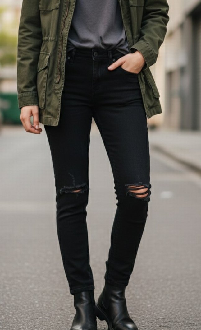 Kadınlar için siyah denim kot pantolon, dizlerinde yırtık detayları ve dar kesimiyle trend sokak stili sunar. Orta boy ve tokalı detaylı, günlük kullanıma uygundur.