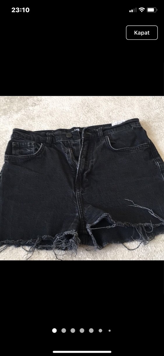 Siyah kot mini şort, bol kesim ve yırtık detaylı ucu ile rahat ve şık bir görünüm sunar. Günlük sokak stiline uygundur.
