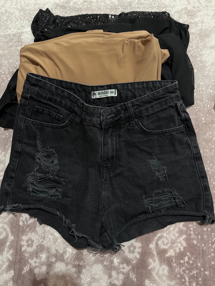 Fitted siyah denim mini şort, yırtık detaylarıyla rahat ve şık bir günlük sokak stili sunar.