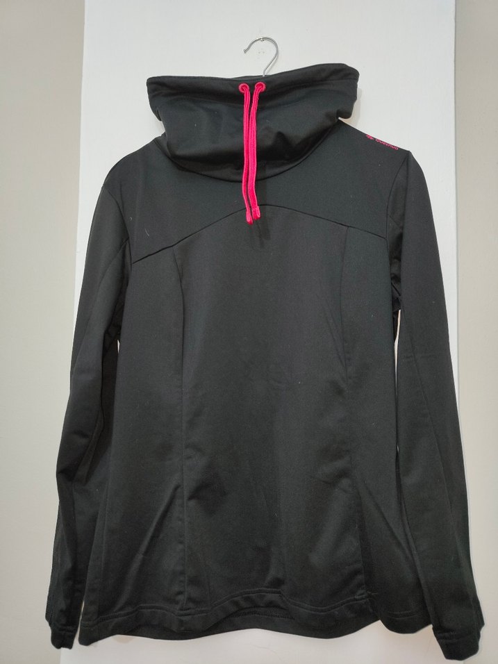 Siyah, yüksek yakalı, uzun kollu kadın ceket. Yumuşak ve sıcak kumaştan. Spor ve günlük şıklık için uygundur. ipi ve marka yazısı pembe renktir!