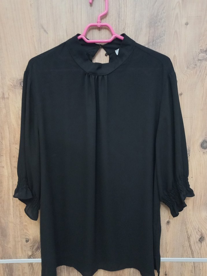 Kadın siyah bluz, yüksek yakalı ve kapri kollu lastikli kol, fırfır detaylıdır. Rahat kesim ve midi boyda, yumuşak sentetik kumaştan. 40-42-44 beden uygun