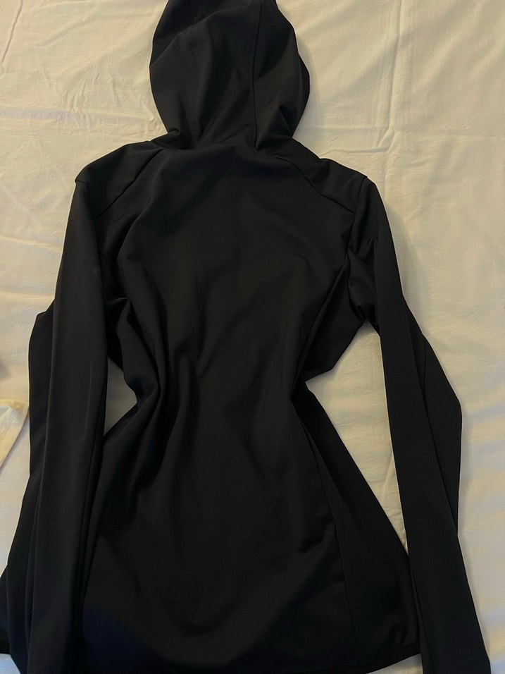 Kadınlar için yüksek yakalı, uzun kollu ve drapeli siyah kapüşonlu, atletik tarzda dar kesim ceket. Günlük sokak modasına uygundur.