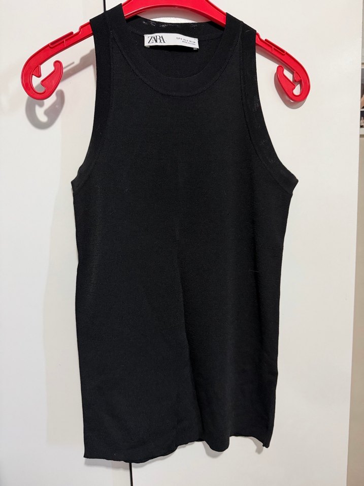Siyah, yüksek yakalı, kolsuz ve belden tokalı, sentetik kumaştan yapılmış dar kesim atlet. Spor ve athleisure tarzlar için uygundur.