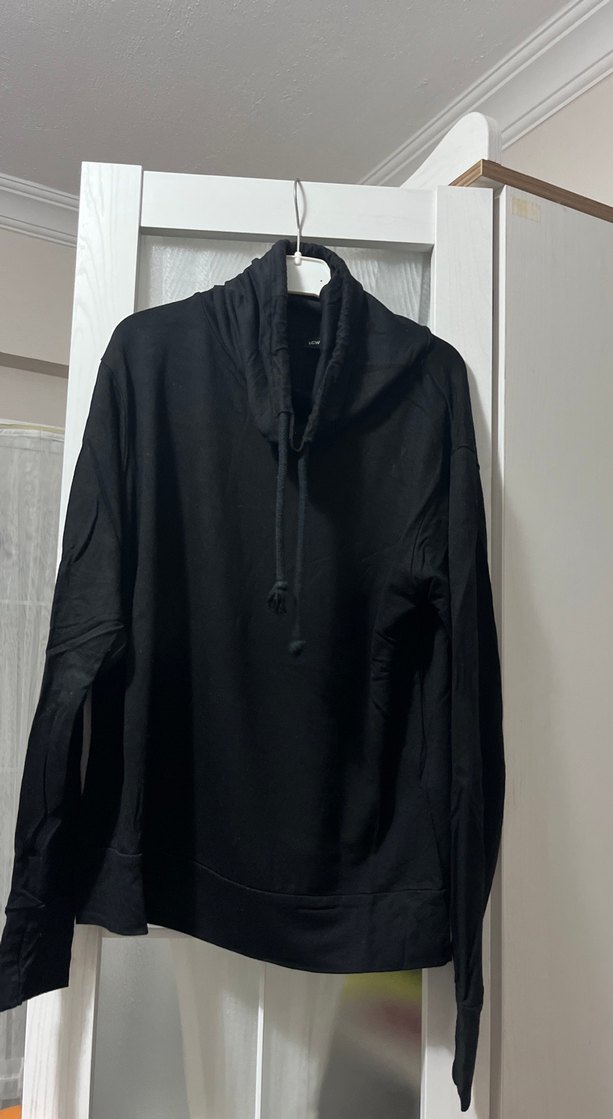 Kadınlar için yüksek yakalı, uzun kollu ve rahat kesimli siyah sweatshirt. Yumuşak keten kumaştan yapılmıştır, günlük kullanıma uygun sade ve şık bir tasarıma sahiptir.