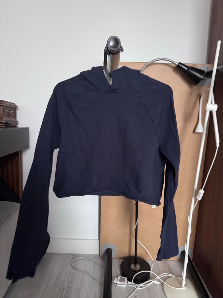 uzun kollu ve lacivert sweatshirt. Crop boyu ve yumuşak, sıcak kumaşıyla günlük kullanıma uygundur. Hiçbir kusuru yok tertemiz