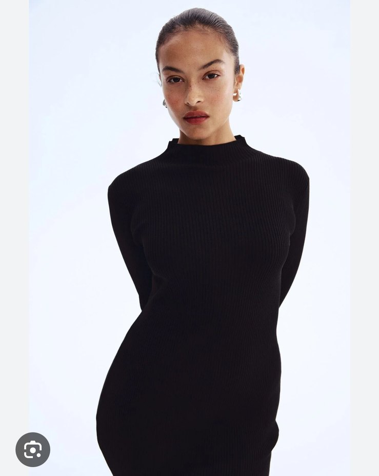 Yumuşak sentetik kumaştan, yüksek yakalı ve uzun kollu, vücuda oturan siyah triko elbise. Midi boy ve minimal tasarımıyla günlük kullanımda zahmetsiz şıklık sunar.