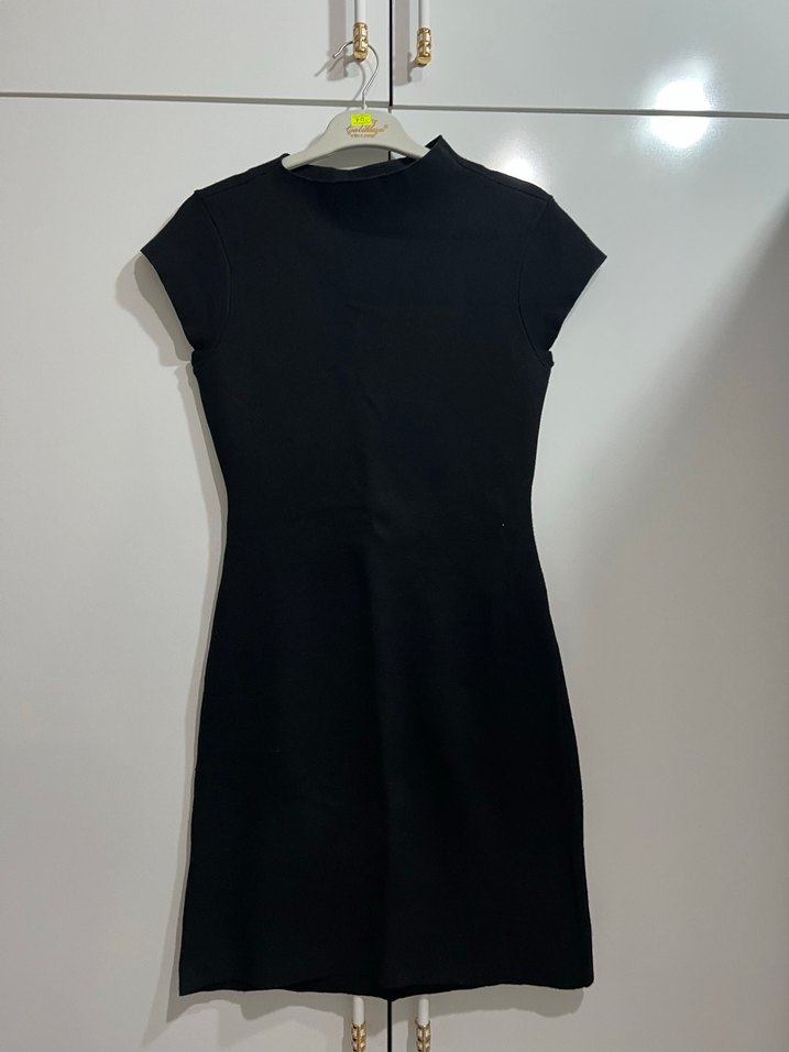 Bu siyah, yüksek yakalı, kolsuz triko elbise, vücuda oturan kesimi ve pürüzsüz sentetik kumaşıyla gündelik sokak stiline uygun minimal ve şık bir tasarıma sahiptir.