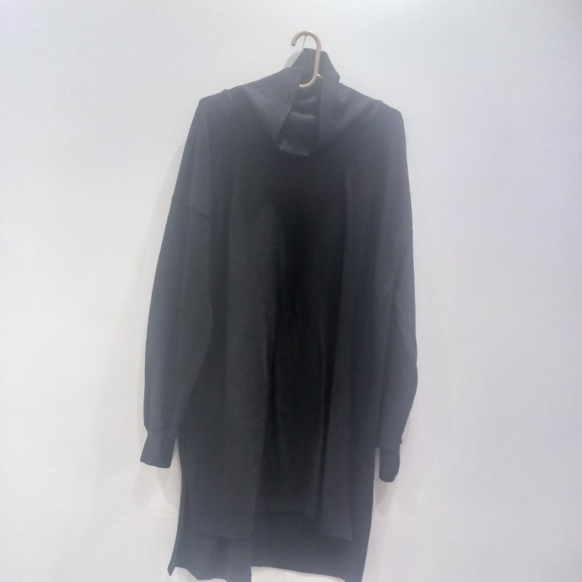 Kadınlar için yüksek yakalı ve uzun kollu, rahat kesimli siyah triko elbisedir. Yumuşak ve sıcak kumaştan üretilmiş, minimalist gotik tarz sunar.