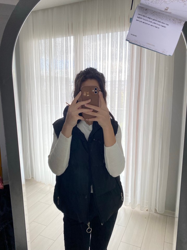 Siyah, yüksek yakalı ve vücuda oturan kesime sahip, yumuşak ve sıcak kumaştan yapılmış kolsuz şişme yelek. Günlük kullanım için minimalist, zahmetsiz şıklık sunar.