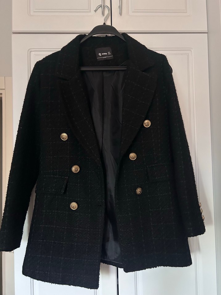 Siyah yün midi blazer, düğmeli ve kesimli yakalı. Uzun kollu, normal kesim, klasik şıklık için uygun ofis stili.