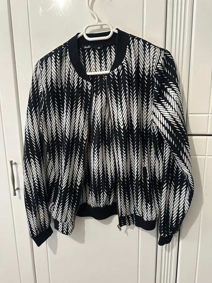 Kadın ceket, siyah-beyaz zebra desenli, uzun kollu ve yüksek yakalıdır. Fermuarlı, cepli,bol kesim, midi boyda ve sentetik kumaştan üretilmiştir. Günlük sokak stili için uygundur.
