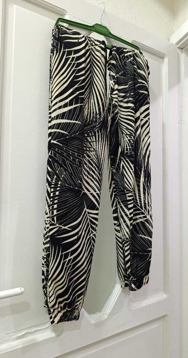 Siyah zebra desenli, pilili ve bol kesim uzun kadın pantolonu. Sentetik kumaştan yapılmış, dış mekan rahat kullanıma uygundur.