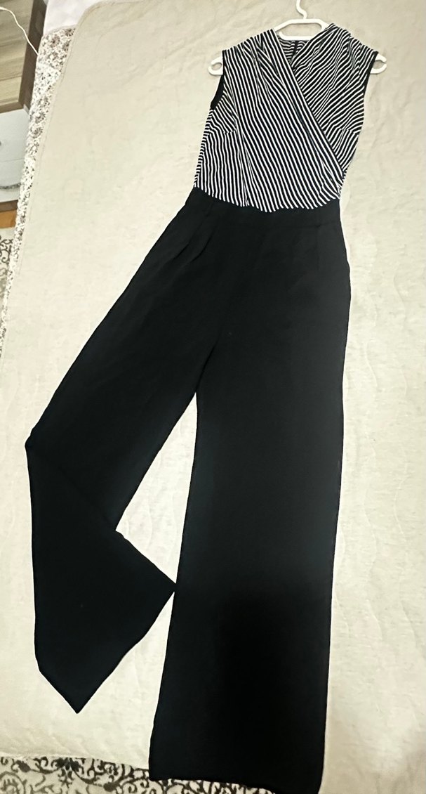 Yüksek yakalı, askılı kısımları olan kadın tulumu, pileli geniş paça ve siyah zebra desenli üst kısmıyla ofis için uygundur.
