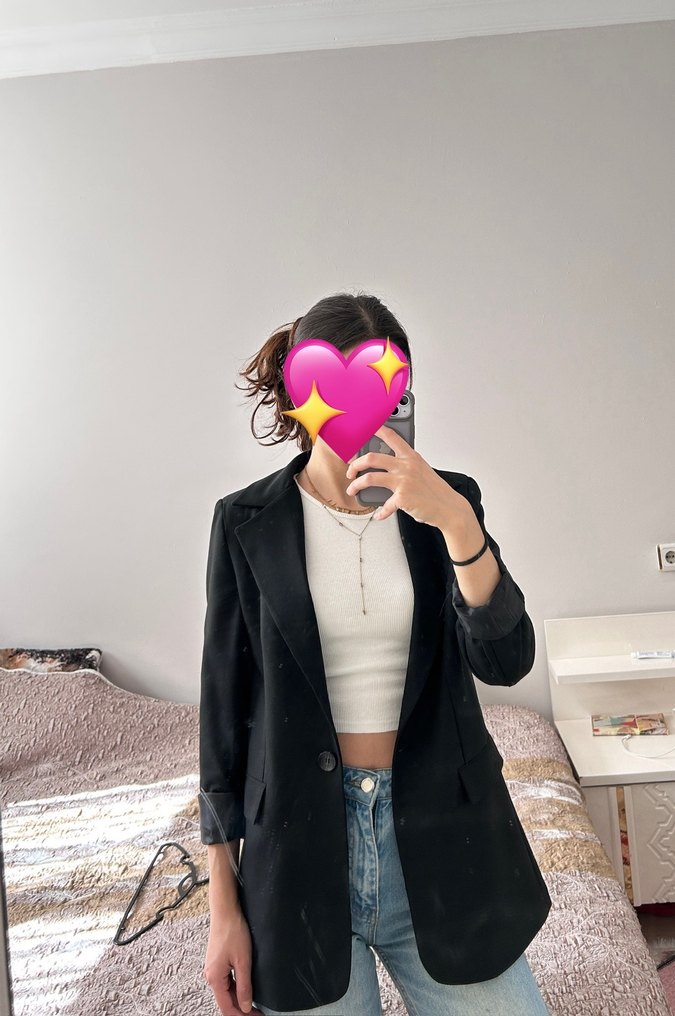 Siyah blazer ceket, kesik yaka ve uzun kollu tasarımıyla dikkat çeker. Sentetik kumaştan üretilmiş, günlük kullanıma uygun şık ve rahat bir modeldir. herhangi bi problemi yok neredeyse hic giyilmedi