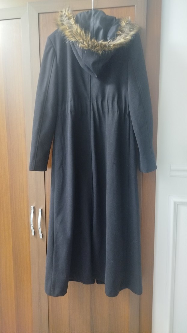 Kadın siyah uzun kaban, düğmeli ve fermuarlı dur Rahat kesim, uzun kollu ve yumuşak, sıcak kumaştan üretilmiştir.