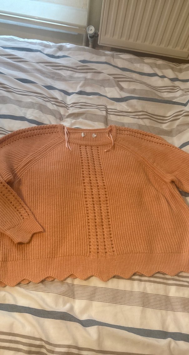 Somon renkte, örgü kumaştan uzun kollu, yuvarlak yaka ve bol kesim bohem tarzda kazak. Günlük kullanıma uygun, midi boyda rahat ve şık.