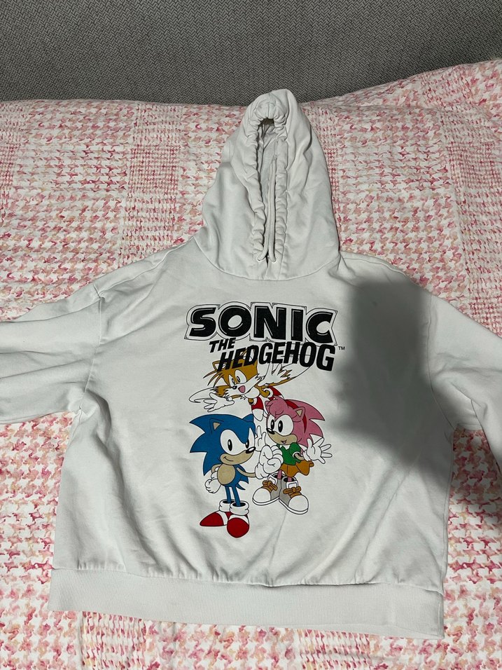 Kadın, kapüşonlu, uzun kollu ve beyaz sweatshirt. Yumuşak sentetik kumaştan, önünde renkli Sonic the Hedgehog baskısı bulunur. Trendy casual tarz için uygundur.