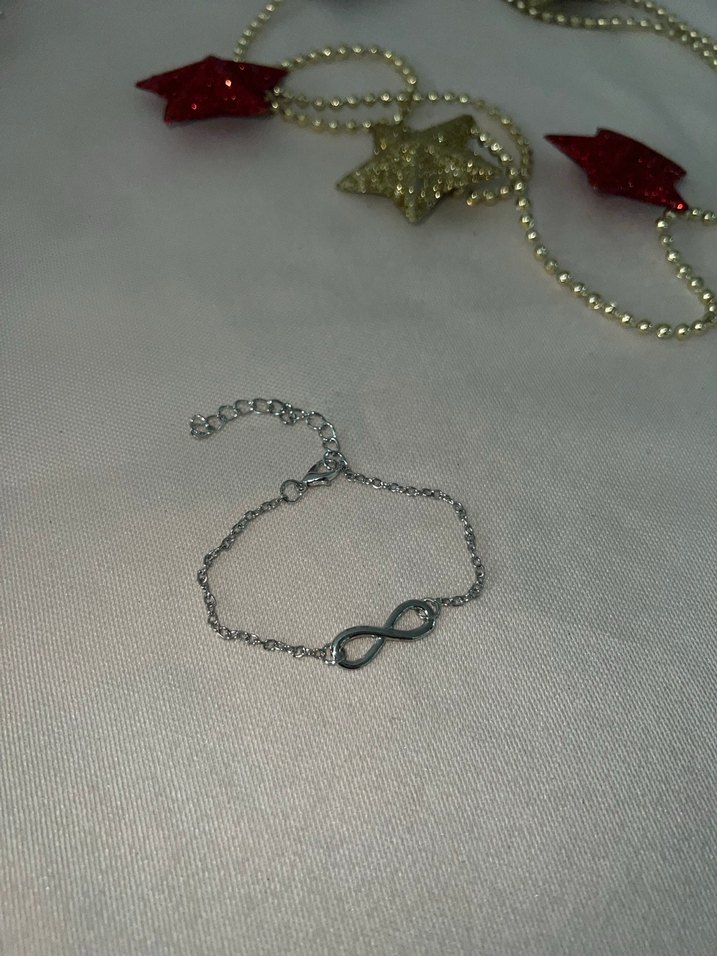 Kadın bileklik, minimalist gümüş zincir ve sonsuzluk figürü ile günlük kullanıma uygun modern tarzda.