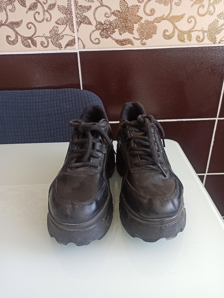 Minimalist ve goth tarzında, dayanıklı kauçuk tabanlı, gündelik kullanıma uygun, desensiz ve sade görünümlü. Bir kere giyildi sıfır ayarında hiçbir kusurur yırtığı söküğü yok bir defa giydim sadece 37