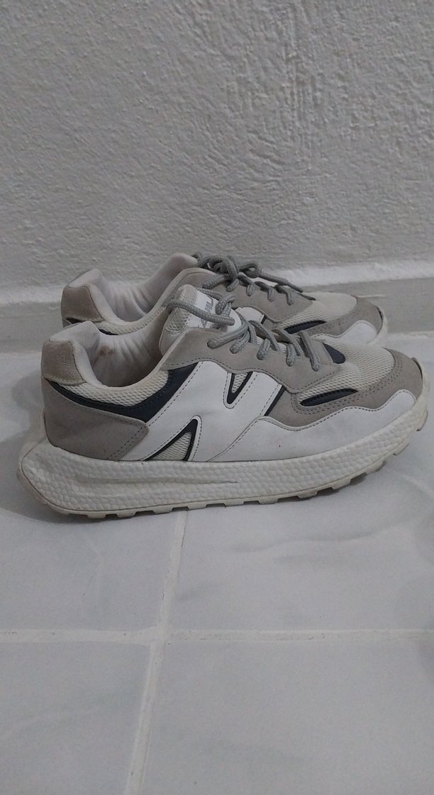 Beyaz ve gri renklerde, kauçuk tabanlı kadın spor sneaker. Sokak stili ve spor için uygun, stiletto topuk görünümü ve desensiz tasarıma sahip.