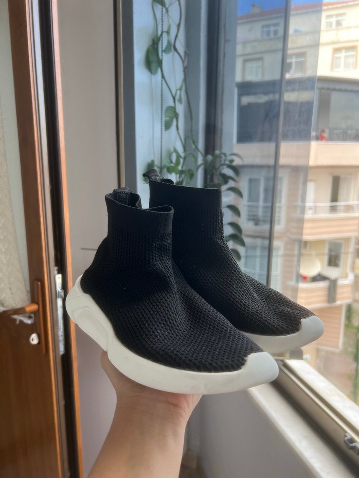 Siyah örgü kumaştan üretilmiş, stiletto topuklu ve kauçuk tabanlı kadın spor ayakkabısıdır. Trendy casual tarzlar için uygundur.