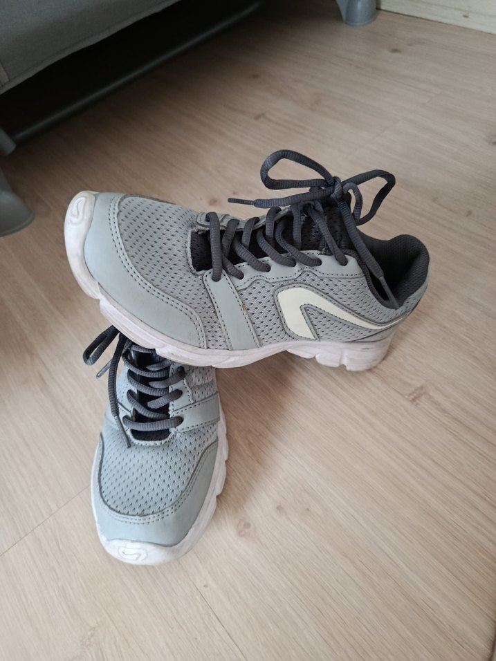 Gri bağcıklı kadın spor ayakkabısı, yumuşak kauçuk tabanlı, sade ve rahat tasarıma sahip. Spor için uygun, günlük kullanım için ideal.